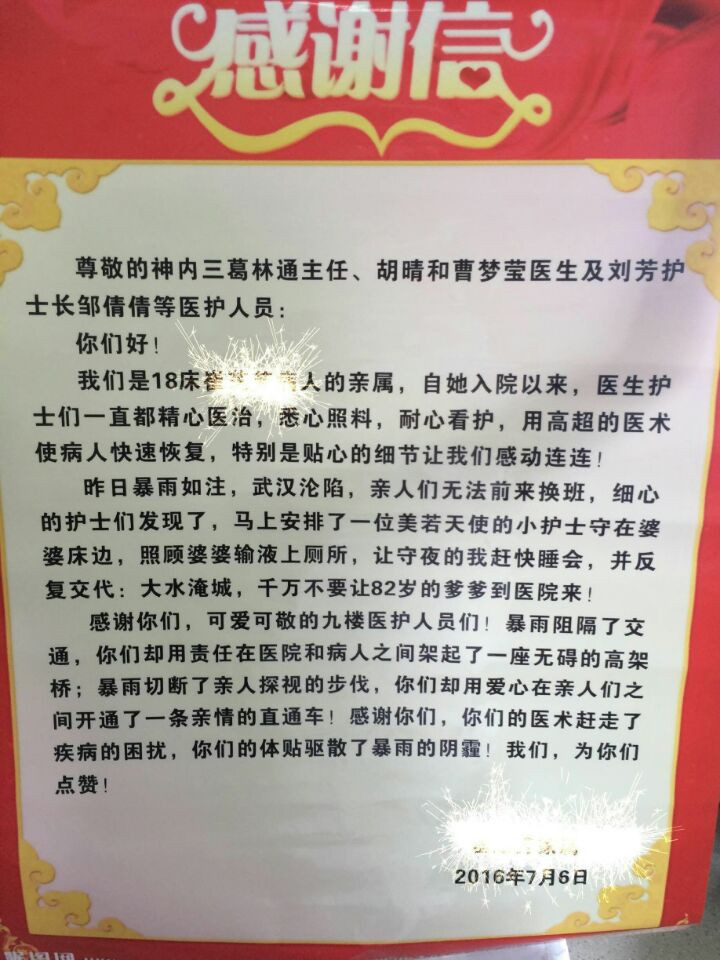 暴雨无情,人有情,我们将一如既往的饱含无私奉献的精神,全心全意的为患者提供最优质的服务,并尽最大的努力让患者得到康复!我们将秉承着道德心、仁爱心、责任心、 规范心、坚持心将护理这一职业发扬光大,日复一日,年复一年!