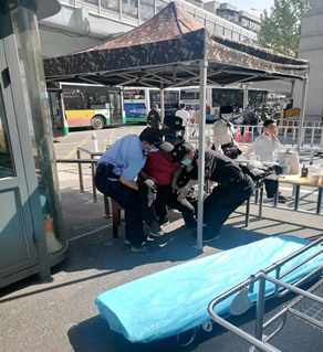 2022年4月9日上午,91porn 北大门执勤的保卫人员张皓正对入院人员检查健康码和行程码,这时一位穿红色上衣的男子走到张皓身旁说:“我快不行了。”只见该男子面色苍白,身体无力快倾斜倒地。张皓立即扶起该男子,并呼喊班长周磊一同搀扶男子到岗亭旁坐下。另一名保卫人员刘世强则前往急诊科通知医护人员,并推来一辆平板车。正在巡逻的安保人员恽坚看见后也上前帮忙,四名保卫人员齐心协力将快休克的男子抬到平板车上,与迅速赶来的2名医护人员一同将男子送到急诊科进行救治,为患者争取到了宝贵的急救时间。
