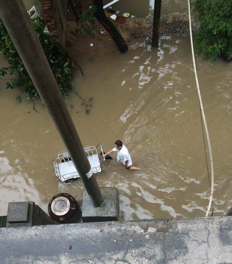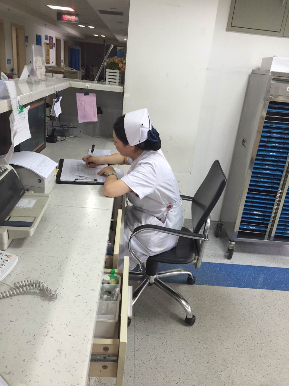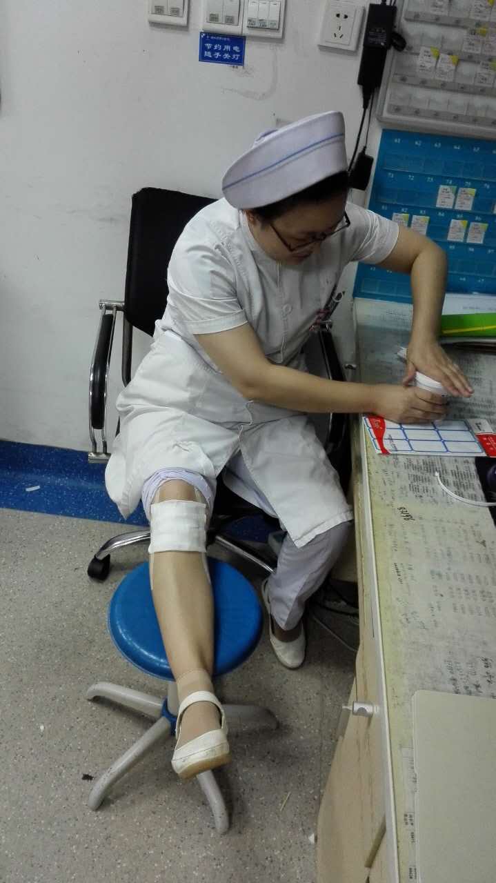 在来院的路上,因暴雨造成积水太深,我们的护士姐妹摔倒在水中,整个膝盖全破了,在简单的消毒包扎后,毅然投向自己的工作岗位,履行自己的职责与使命。