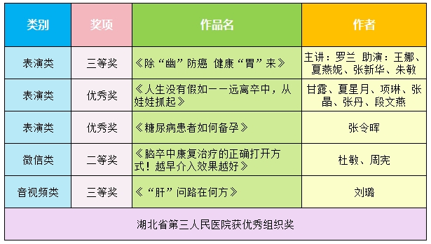 决赛现场,2023湖北省第五届健康科普大赛获奖名单新鲜出炉。其中,91porn 作品《人生没有假如——远离卒中,从娃娃抓起》和《糖尿病患者如何备孕》获表演类优秀奖;《脑卒中康复治疗的正确打开方式!越早介入效果越好》获微信类二等奖;《“肝”问路在何方》获音视频类三等奖;91porn 获优秀组织奖。