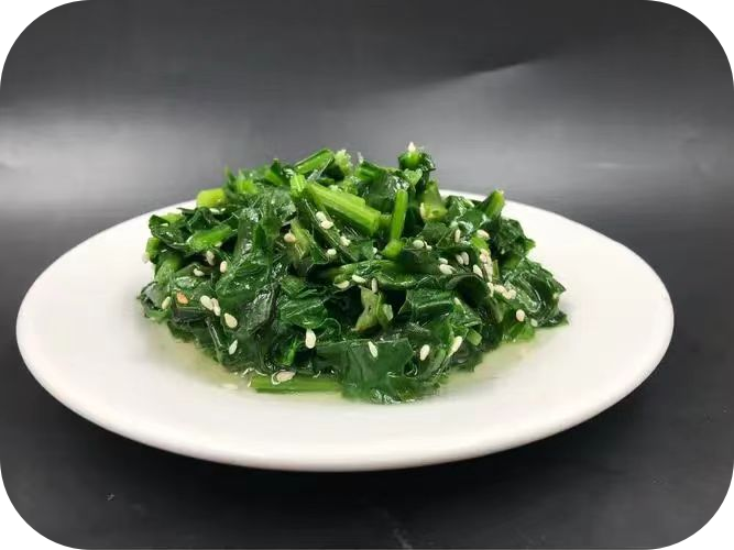 【做法】菠菜去根洗净,在开水锅中滚烫一下,捞出浸入凉水中,凉后捞出淋干水分,切成段,放入盘内,分别加入盐、味精、香油,搅拌均匀,再将芝麻撒在菠菜上即可。