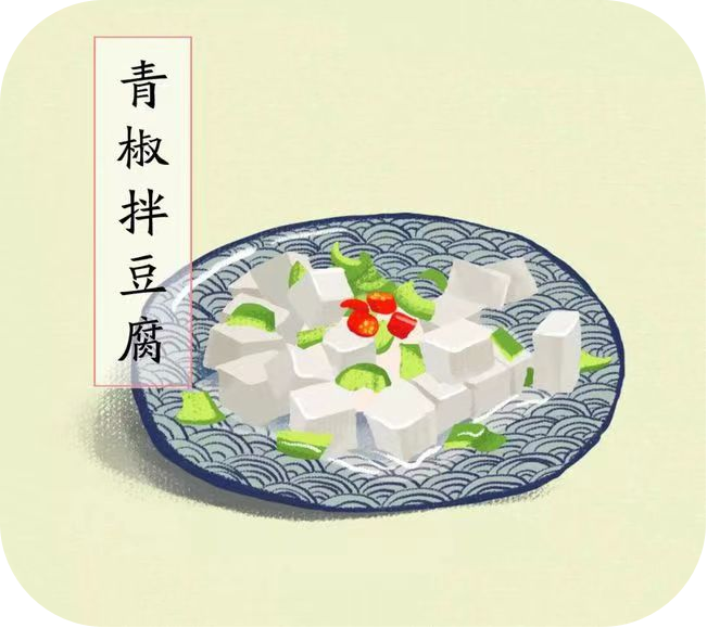 【配料】豆腐1块,青椒3个,香菜10克,香油、盐、味精各适量。