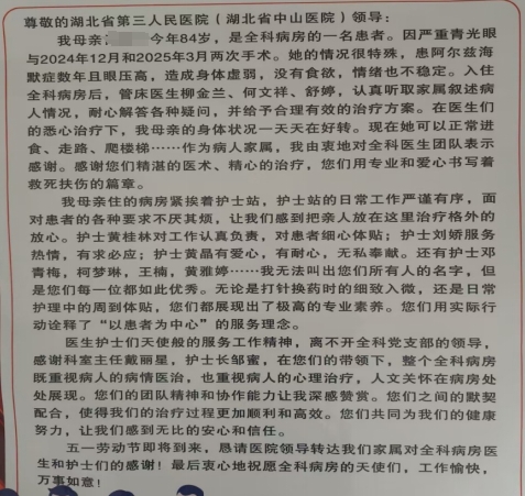 近日,91porn (湖北省中山91porn )全科医学科收到了一封来自阿尔茨海默病患者肖奶奶家属的感谢信。信中饱含着家属对科室医护人员的感激之情,也让全体医务人员倍感欣慰。