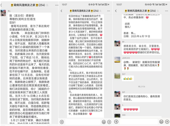 龙利主任根据活检结果判断,焦女士的肾脏正处于急性进展阶段,尽管肾功能已严重衰竭,但仍有一线生机。在充分告知药物风险后,龙利主任大胆采用大剂量糖皮质激素冲击疗法,并联合多种靶向药物进行治疗。治疗初期,病情并未明显好转,每日仅能排出几滴尿液。焦女士甚至做好了接受透析的准备。然而,一周后,奇迹出现了!焦女士开始排尿,虽然最初只有一小杯,但随后的几天,尿量逐渐增加,水肿日渐消退,肾功能也逐步恢复。出院时,焦女士的肾功能已恢复正常,水肿消退后,这位“美女”患者也重拾往日风采,小尖脸、小蛮腰再次回归。