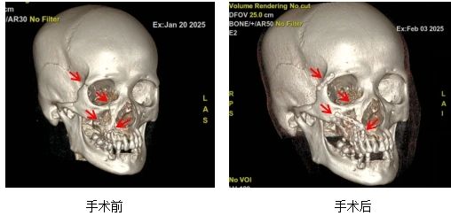 手术当天,倪小兵团队凭借精湛的医术历经3个多小时,成功为刘女士实施了右侧上颌骨/眶骨/牙槽骨骨折切开复位内固定术。术后,经过预防感染及消肿治疗,在护理团队的精心护理下,刘女士状况恢复良好。目前,刘女士已顺利出院,出院时她的右侧眶周及颧面部不再肿胀,皮肤色泽恢复正常,张口度、开口型及咬合关系均恢复正常水平,患者对倪小兵主任精湛的医术赞不绝口。