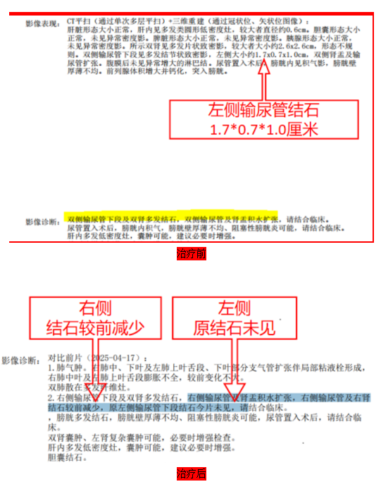 在服用了十几天中药后,神奇的事情发生了。王爹爹起夜时发现马桶里有几颗小米粒大小的结石,还有一些小沙粒。渐渐地,他的腰痛症状消失了,尿液也变得清澈透亮。治疗一个多月后复查 CT,结果显示左侧输尿管结石全部排净,右侧结石数量减少,肾功能指标也明显好转。