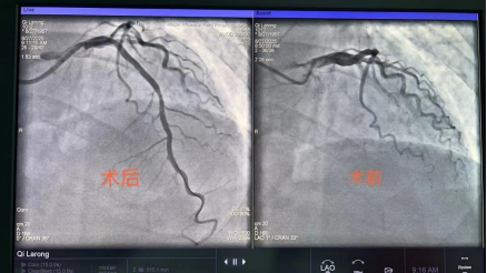 患者抵达导管室后,心血管内科团队迅速到位。冠状动脉造影显示,祁婆婆前降支近段完全闭塞(LAD近段100%闭塞),这是导致心肌梗死的“罪犯血管”。团队立即实施急诊PCI术,成功将导丝通过闭塞段,球囊扩张后,于前降支植入一枚药物洗脱支架,血流恢复TIMI 3级,整个过程仅用时35分钟。术后,祁婆婆胸痛症状迅速缓解,生命体征平稳,现已转入CCU进一步观察,预计近期可出院。