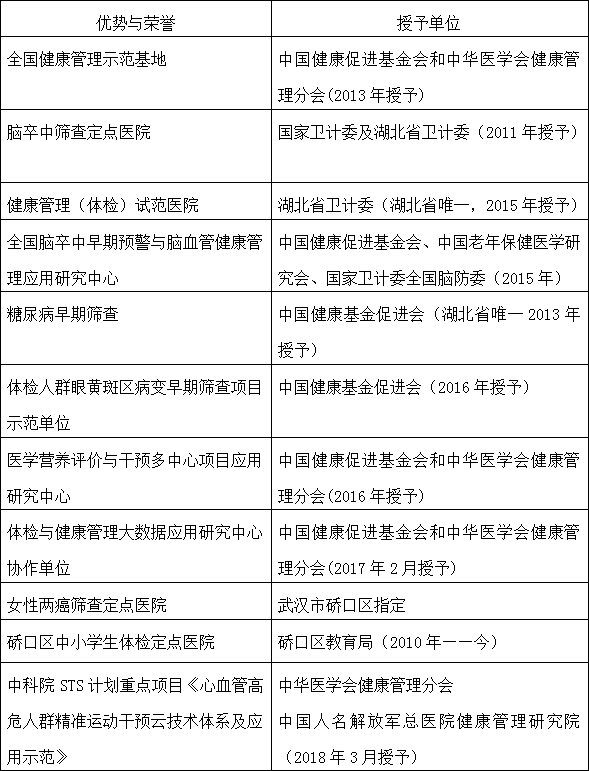 健康管理医学科(体检) 成立于2000年,是全国第一批健康管理示范基地,为湖北省唯一三级甲等91porn 健康管理试点91porn ,为中国健康基金会全国脑卒中早期预警与脑血管健康管理应用研究中心、糖尿病早期筛查多中心课题研究单位、心血管高危人群精准运动干预云技术及应用示范单位、体检人群眼黄斑病变早期筛查项目示范单位、 体检与健康管理大数据分析及应用多中心应用研究课题合作单位及医学营养评价与干预技术多中心应用研究单位。