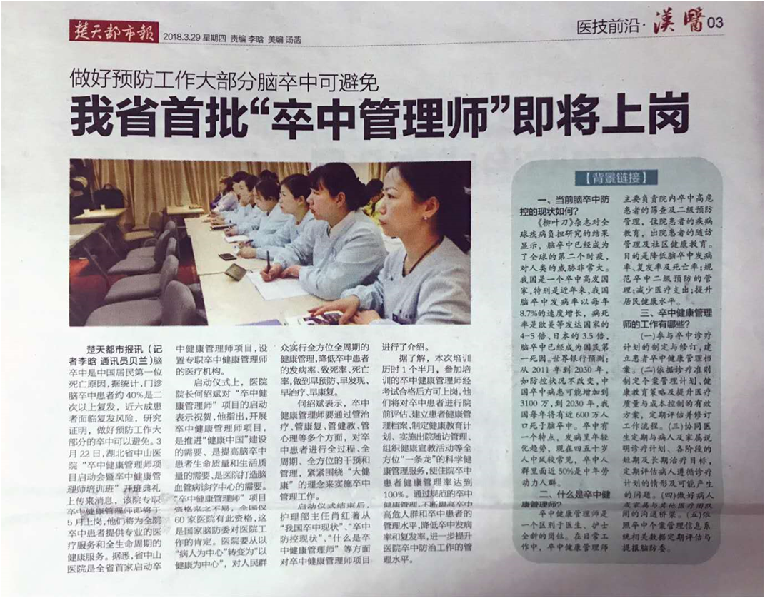 健康管理是近年来针对以卒中为代表的高危慢性疾病提出的一种管理模式,有研究表明可显著减低疾病发生率,有效减少医疗支出。卒中健康管理师项目将在疾病预防和社会医疗保障等领域均发挥重要作用。脑卒中健康管理师主要负责院内卒中高危患者的筛查及二级预防管理,住院患者的疾病教育,出院患者的随访管理及社区健康教育,通过管治疗、管康复、管健教、管心理等多个方面,对卒中患者进行全过程、全周期、全方位的干预和管理,紧紧围绕“大健康”的理念来实施卒中管理工作。