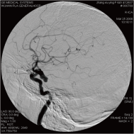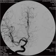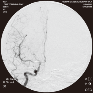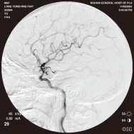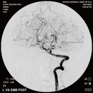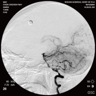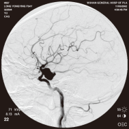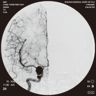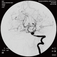 右侧颈内动脉后交通动脉瘤栓塞术前 左椎动脉造影 示左椎动脉夹层动脉瘤: 左椎动脉发出小脑后下动脉处呈囊性扩张,动脉瘤远端血管狭窄
