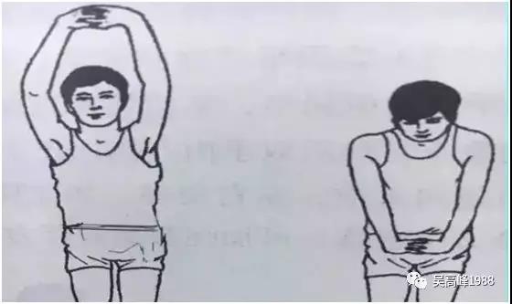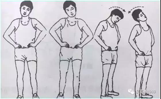 取站位,躯干挺直,双脚自然分开与肩同宽,全身放松,双眼自然开合,头颈中立位,精神集中于动作上。双手叉腰,头颈左侧屈、右侧屈、后仰。 按此反复做完第4个8拍后,头颈复回中立位。可锻炼颈项前、后、左、右的活动功能,加速颈肌血液循环,消除阻滞,防止颈项软组织粘连和韧带钙化,消除哦疲劳等。