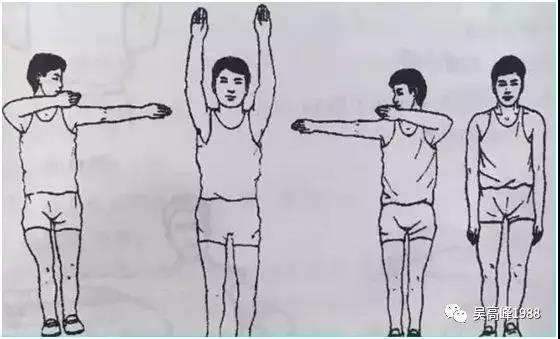双手开掌自然放下,同步进行,左手外展平肩,右手向左侧斜举,掌指均伸直放开,头颈随手旋转向左侧,双目转向双手所指的前方;然后双手由左侧向正上方自然举起,头颈随手旋转,至仰面朝天,双目望向天空,左右交替。如此反复做完4个8拍,动作复原。如此全方位锻炼,可加强头颈肩壁力量。