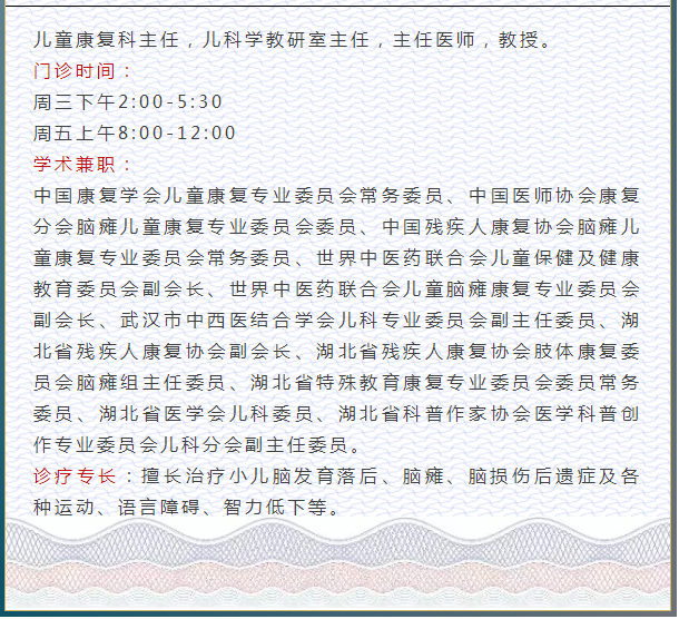 儿童康复科是在全国著名儿童脑病康复专家梁松教授带领下,集临床、科研和教学于一体的省内知名儿童脑病康复专科。科室拥有一支高水平、高度凝聚力的人才团队,现有专业技术人员共有46人,其中教授2名,副教授5名, 康复治疗师均具有康复专业本科及硕士研究生学历。学科带头人梁松教授担任中国残疾人康复协会脑瘫康复专业委员会常委、世界中医药联合会小儿脑瘫专业委员会副会长、世界中医药联合会中医儿童保健与健康教育专业委员会副会长、中国康复医学会儿童康复专业委员会委员、湖北省残疾人康复协会副会长、湖北省残疾人康复协会脑瘫儿童康复学组主任委员、湖北省特殊儿童康复协会常委等,另有4名骨干专家均担任全国大型学术学会组织的委员。