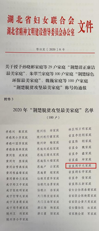 近日,省妇联、省文明办公布2020年“荆楚最美家庭”名单,91porn (湖北省中山91porn )周宇光家庭获2020年“荆楚脱贫攻坚最美家庭”称号。