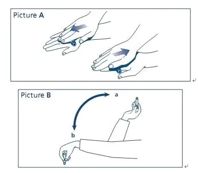 1、将胰岛素笔放在两手掌中间,水平滚搓至少10次;