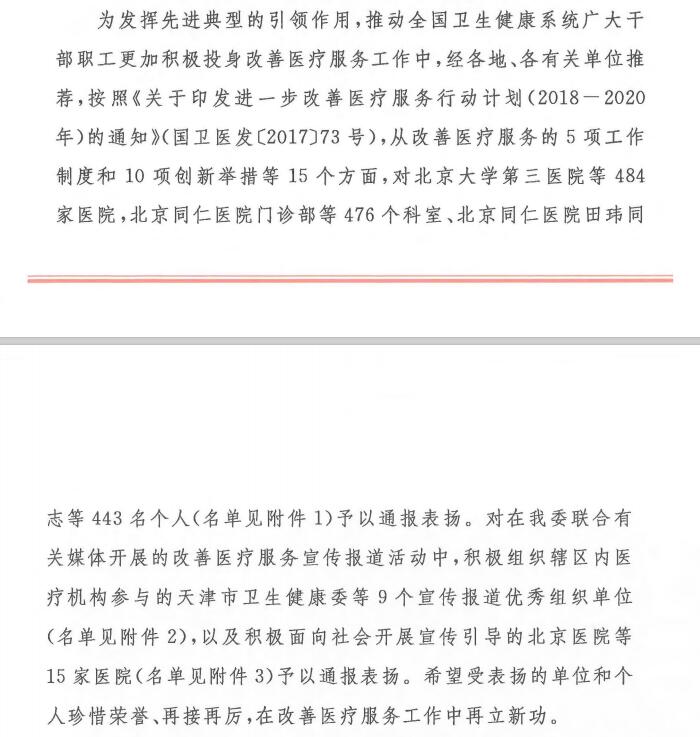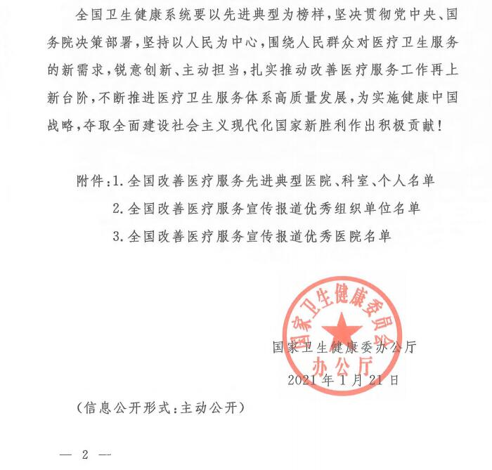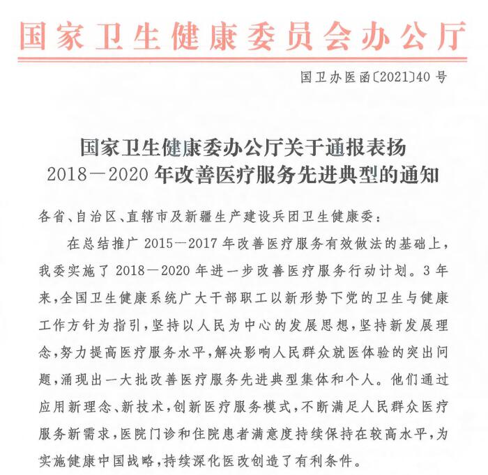 1月26日,国家卫生健康委办公厅发布《关于通报表扬2018-2020年改善医疗服务先进典型的通知》,对在改善医疗服务的5项工作制度和10项创新举措等15个方面中涌现出的先进典型集体和个人、积极组织辖区内医疗机构参与改善医疗服务宣传报道活动的优秀组织单位进行通报表扬。