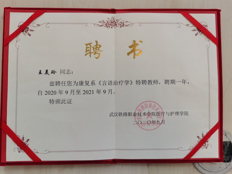 王美玲 ,本科学历,ST主管技师,二级心理咨询师,武汉铁路职业技术学院康复医学治疗技术专业特聘教师,担任《言语治疗学》教学工作。在多年的工作中自创了一套儿童言语构音治疗方法,深得患儿家长的高度评价,擅长各类儿童的言语障碍康复训练,把心理学的知识运用到康复训练中。多次受邀在省学习班授课,帮助同行共同进步,数次至上海华东师范大学言语听觉实训班学习至,发表文章数篇,其中在中国康复医学会儿童专委会发表的《儿童流口水常见的原因及训练方法》深受同行的认可和好评。担任中国康复医学儿童专委会会员,武汉医学会物理医学会与康复学分会第八届委员会言语治疗学组委员。