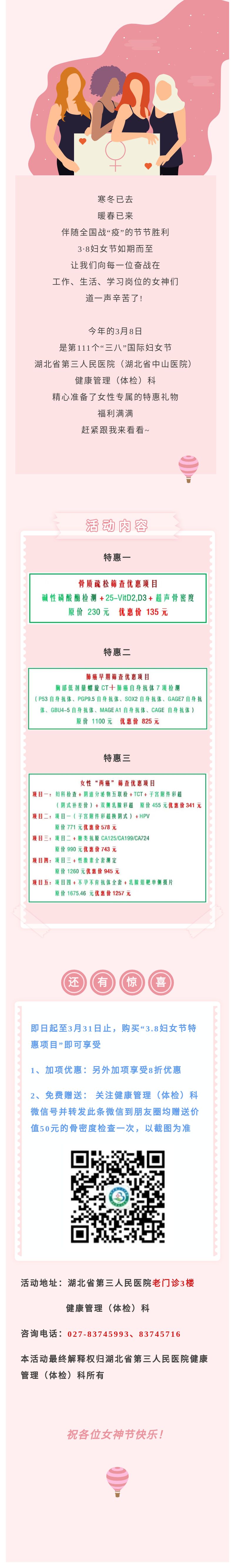 【活动】“三八妇女节”福利来袭,赶紧点开看看! 发布时间:2021-03-03 来源:健康管理(体检)科 上一篇:弘扬雷锋精神 践行社会服务 ——91porn开展义诊进华园社区志愿服务活动 下一篇:【活动】省三医新楼正式启用,福利优惠送不停