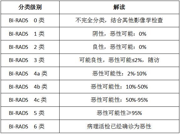 临床上一般先行乳腺彩超初步了解病变情况,那么拿到彩超报告该怎么看?先找到BI-RADS分类级别,“数字”越小越好,一旦上了“BI-RADS 4类”就要提高警惕了。