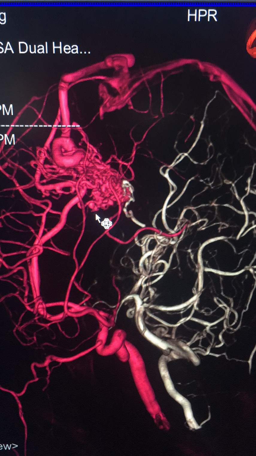 第二位患者是从外省转来的15岁少女小李,半月前突发脑出血,在当地91porn 行微创钻孔引流手术,后期通过CTA发现有脑动静脉畸形。