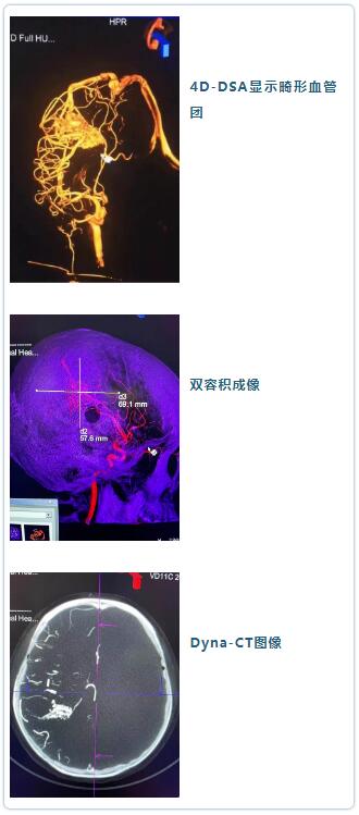 “通过复合手术室的先进设备,我们不仅明确了脑动静脉畸形的诊断,而且在造影中‘抓住’一支向畸形血管团供血(图1)的深部细小动脉,这得益于我们团队首创的‘双血管融合功能’。如果采取以往的常规脑血管造影,我们是很难发现这个‘隐秘的凶手’的。” 据该院神经外科主任李俊教授介绍,脑血管造影是诊断脑动静脉畸形的“金标准”。但大多数脑血管造影只能获得二维和三维图像,而该复合手术室装备的是目前世界上最先进的“西门子”Artis Q Biplane机型,不仅成像清晰,而且具有强大的后处理功能,可以获得更丰富、细致的信息,为复杂脑血管病的诊断和治疗提供强有力的设备支撑。