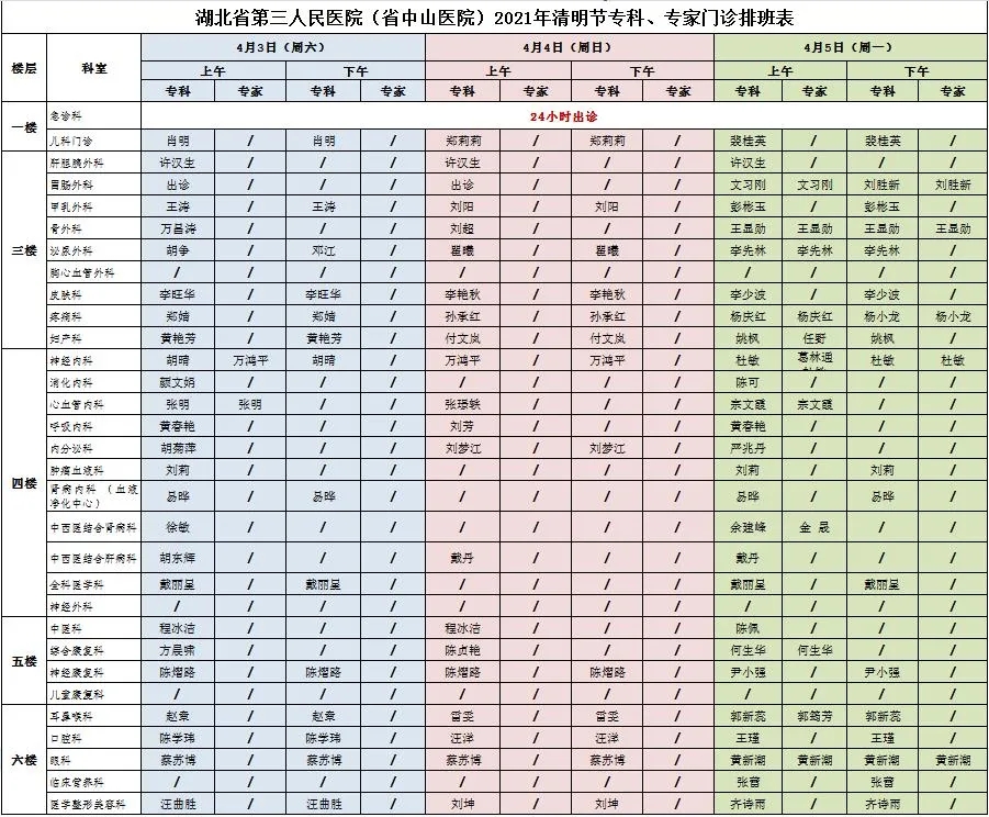 【通知】91porn 清明节门诊安排 发布时间:2021-04-02 来源:门诊办公室 清明节放假期间(2021年4月3日-5日),急诊24小时应诊,专科门诊以当日安排为准;超声、放射、检验等医技科室24小时值班。 咨询电话:027-83745674,83745675 上一篇:星星之火 燎原我省脑心健康管理事业蓬勃的春天 ——湖北省脑心健康管理师培训基地第一期培训班圆满闭幕 下一篇:清明时节,养肝正当时