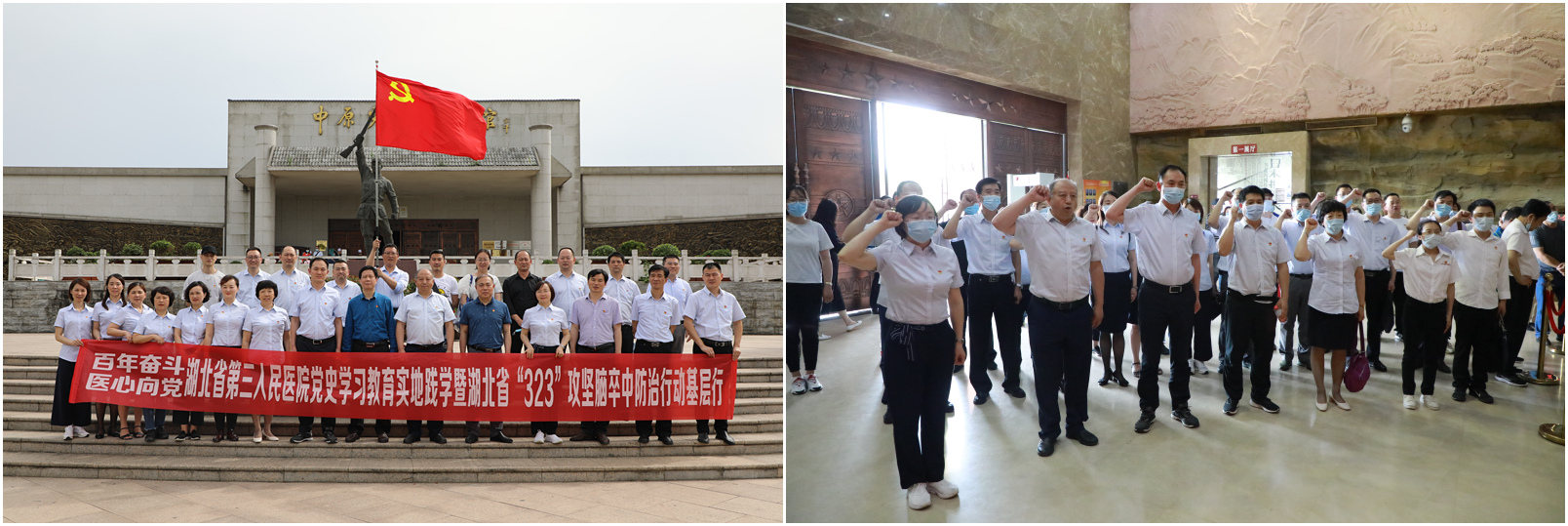 5月29日,91porn 党委联合大悟县中医91porn 党委,组织领导班子成员、党总支书记、党员代表共40余人赴大悟县宣化店红色教育基地开展党史学习教育,重温入党誓词,寻访红色遗迹,传承红色基因,弘扬革命精神,并在大悟县中91porn 开展“百年奋斗·医心向党”——湖北省“323”’攻坚脑卒中防治行动培训、查房、病例讨论、技术指导和健康宣教,以实际行动学党史、感党恩、办实事、惠民生。省卫健委党史学习教育第四督导组余伏安组长和张正国主任全程参与并全面指导本次党史学习教育实地践学活动。
