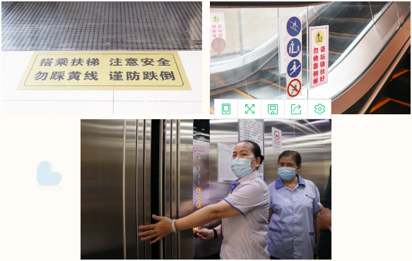 5、各直达电梯配备专人服务,遇有老人及腿脚不便患者提醒和搀扶患者上下电梯。扶手电梯均有醒目标识提醒患者预防跌倒。