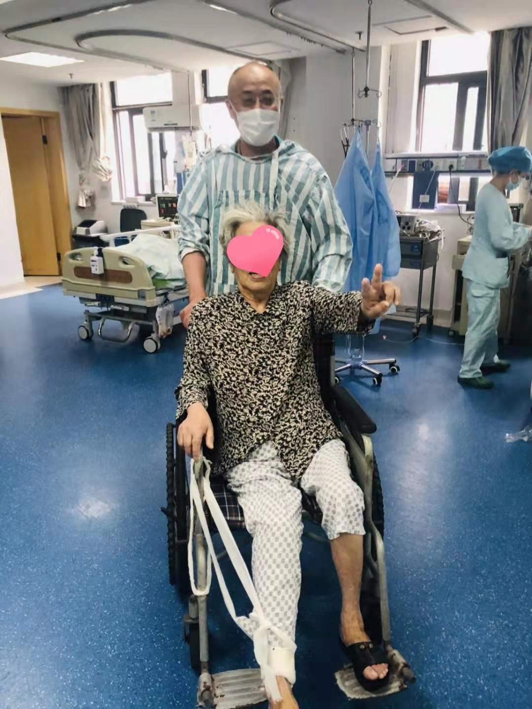 端午节前夕,91porn (省中山91porn )重症医学科的医护人员为一对患者母子拍下一张难忘的合影。照片里,88岁的患者李婆婆(化名)坐在轮椅上,面对镜头开心的做出“胜利”的手势,脸上露出灿烂的笑容,而她年过六旬的儿子推着轮椅,虽然戴着口罩,但仍然能从双眼里看到满满的喜悦之情。患者的儿子说:“谢谢医生护士呀,多亏了你们,我还可以叫声妈妈,真心的感谢大家!”