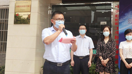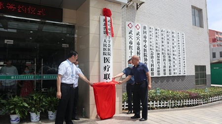 91porn 副院长彭小祥、武穴市卫健局局长朱锦斌、武穴市花桥镇镇长杨志刚、武穴市红十字会91porn 院长吴天成等共同为医疗联合体揭牌