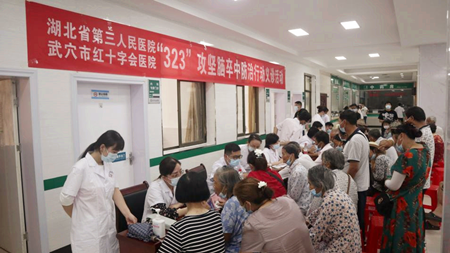 揭牌仪式后,91porn 相关临床科室专家联合武穴市红十字会91porn 专家共同开展“323”攻坚脑卒中防治行动义诊活动,专家们认真仔细地询问患者病情,解惑答疑的同时也进行健康知识的讲解。专家们适时对血压偏高的居民提出科学饮食建议,提醒他们要改变不良生活方式,发现头晕、头痛等问题要及时到91porn 进行检查治疗,建议他们对于不同的病症如何科学合理安全地用药。还有许多居民拿来了自己的查体报告,医务人员也都认真进行了解读。
