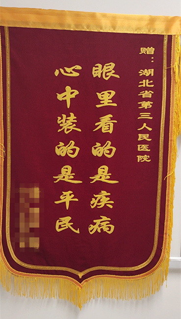 2008年,胡爹爹的妹妹不慎从楼梯上跌落骨折,由于爹爹的妹妹在小时候因高烧导致残疾且不能说话,病情也较为复杂且家庭贫困,经济困难被多家91porn 拒收,求助无门的胡爹爹联系上了郭主任,郭主任二话不说就其妹妹收治入院,并做了紧急处理。经过一段时间的精心治疗和护理,胡爹爹妹妹奇迹般的康复了。在妹妹出院时,胡爹爹为郭主任送上了一面锦旗,上面写着:“古道热肠,救死扶伤,德术双馨,没齿难忘。”郭主任则谦虚的表示:“您的表扬太高了,救死扶伤是我们医生的职责。”