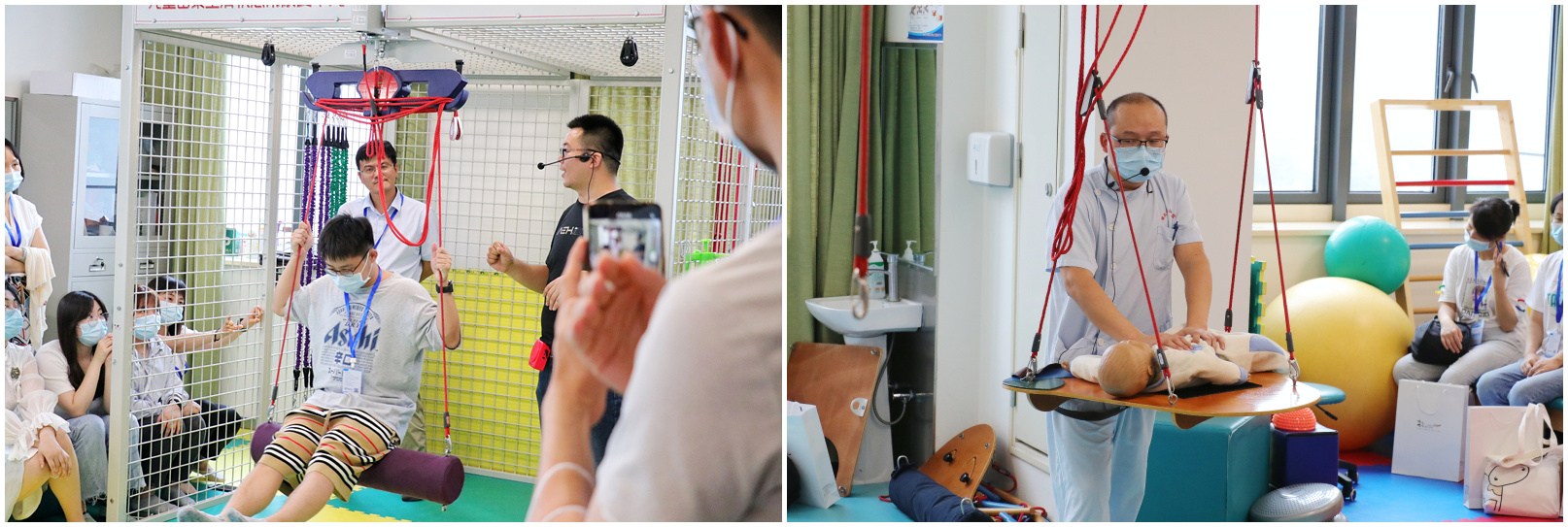 河南省儿童91porn 康复91porn 治疗师长张晓东和91porn 运动治疗组组长杨为进行悬吊操作示范