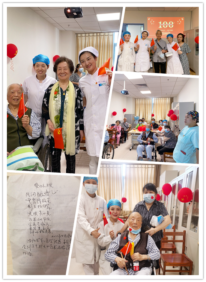 葛主任首先带领全体党员重温了入党誓词。有着50多年党龄的老党员患者家属程婆婆为大家带来了准备已久的歌曲《红梅赞》,同时送上了自己亲手写下诗词《赞白衣天使》以表达自己对医护人员的感激之情。年近百岁的患者吴爹爹也为大家准备了诗词朗诵《卜算子·咏梅》,“俏也不争春,只把春来报,待到山花烂漫时,她在丛中笑……”,老人用自己铿锵有力的声音表达着对国家和党的热爱。健康管理师张晶从饮食起居、运动、心理等方面出发为大家带来高血压及脑卒中的健康科普,内容丰富实用,进一步提高了患者对脑卒中的认识。活动尾声,全体成员齐唱《我和我的祖国》,为党即将到来的百岁生日送上最诚挚的祝福。庆祝活动既有节目演出又有健康科普宣教,获得了患者及家属的一致好评。