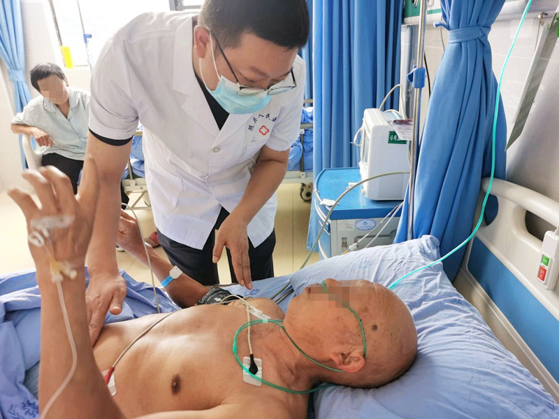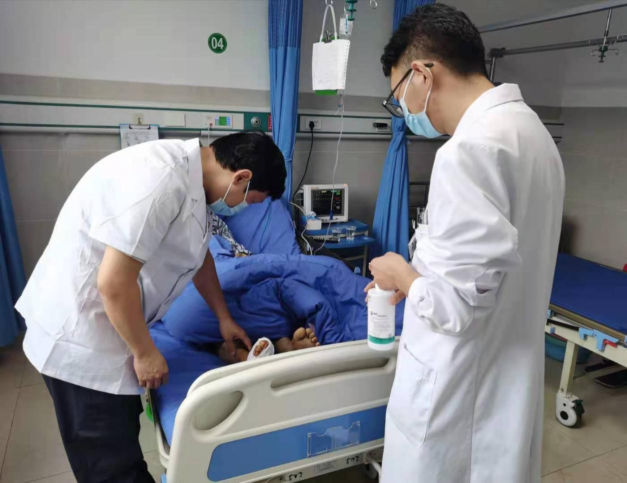 8月14日,省第三人民91porn 医疗救治组刘黎明、江南芳到内科病房进行查房。78岁的汪爹爹在逃生过程中被一个破盆子戳伤左下肢和左脚导致发热,被救援队紧急送到随县人民91porn ,查体时刘黎明发现患者左下肢有一片红肿,且左侧拇趾和足后跟都有破溃,皮温明显升高,目前体温37.9℃,提示感染非常严重。刘黎明主任向管床医生了解病人目前的辅助检查结果和用药情况并建议调整抗感染治疗方案。临走时刘黎明嘱咐汪爹爹:“您一定要安心治病,有什么不舒服、不清楚的地方随时提出来,我们都会尽力帮您解决。”