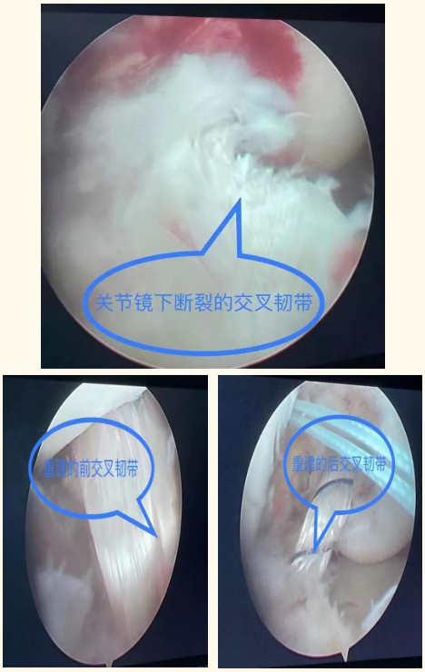 手术当天,王显勋主任带领团队为赵女士在连硬外麻下行右膝前、后交叉韧带断裂关节镜下取双侧腓骨长肌腱移植修复术+内侧副韧带、髌骨内侧支持韧带断裂铆钉缝合修复术+关节腔清理术。术中取患者双侧腓骨长肌腱来修复已断裂的前、后交叉韧带,关节镜下见重建的前、后交叉韧带张力、活动度满意,铆钉固定缝合断裂内侧副韧带固定牢固,髌骨支持带固定牢固,一个半小时后,赵女士被顺利推出手术室。