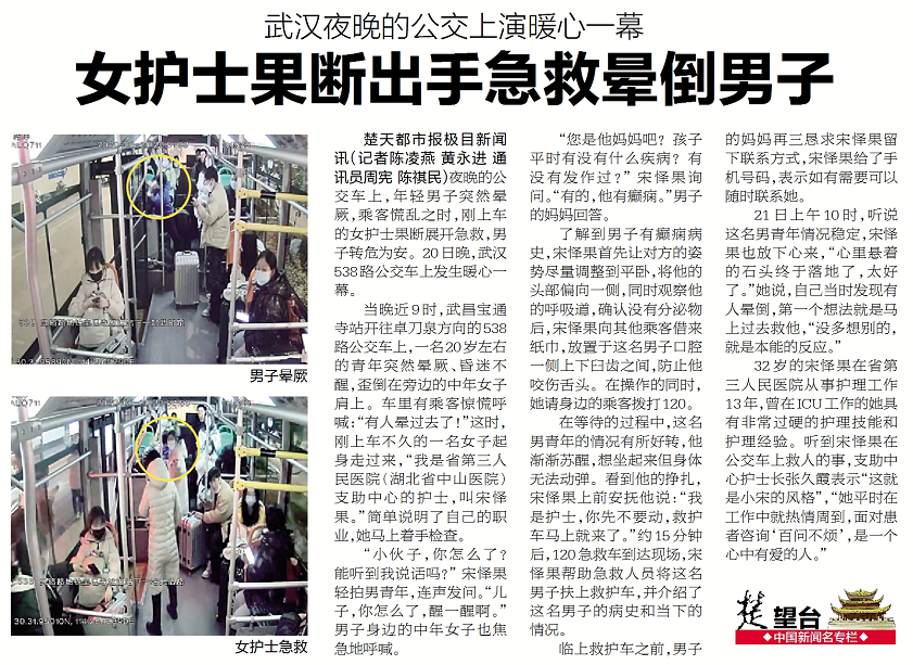 【楚天都市报】武汉夜晚的公交上演暖心一幕 女护士果断出手急救晕倒男子 发布时间:2022-02-22 来源:楚天都市报 上一篇:【楚天都市报】去海南过冬突发心梗,八旬老人紧急转运回汉获救 下一篇:【楚天都市报】老人患青光眼不想治,医生手术助她重拾视力