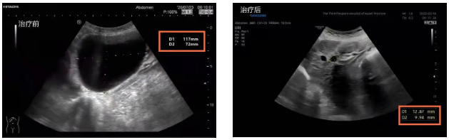 消除顾虑后的李婆婆欣然接受了治疗,术后囊肿缩小到1.3cm×1.0cm,治疗后为了防止囊肿复发,刘黎明主任根据李婆婆的体质应用中药辩证施治,术后随访1年,囊肿持续缩小,原本巨大的囊肿变得只有花生米大小,肝功能也恢复正常,于是就出现了开头的一幕。