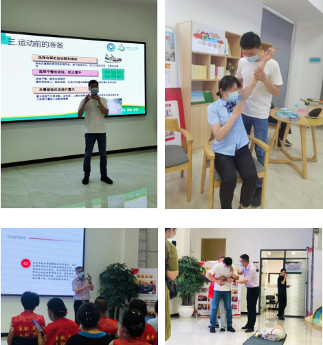 中心技师长聂书剑就中老年人锻炼的注意事项进行授课,为居民详细讲解了选择运动的环境、方式、运动前的准备、运动的步骤,老年人锻炼误区,锻炼注意事项等。急诊科副主任邓君讲授了烫伤、扭伤、切割伤、炸伤等常见外伤的家庭处理方法,脑溢血、休克、气管异物、鱼刺卡喉等常见重要疾病的急救,及夏季常见意外溺水、中暑、蚊虫叮咬的预防和急救知识。队长肖芳教大家学习心肺复苏急救技能和AED的使用方法。现场既有理论讲解,也有操作示范指导,大家亲身体验、互动频繁,取得了良好的培训效果。大家纷纷表示,急救和常见病知识很重要,能保护自己,保护家人,希望医护人员能持续开展科普课堂进社区的志愿活动。