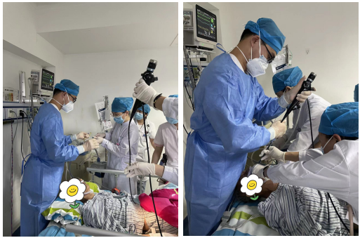 当天,该科副主任医师梁音巡视病房时发现重症室内一位高龄患者躁动不安,护士正在一旁紧急吸痰,但由于患者肺部感染极重,常规吸痰效果不佳。眼看患者面临窒息风险,梁音当即想到通过主动插管争取救治时机,便积极给家属做沟通工作。在取得患者家属同意后,早就在一旁等待的黎威医生立即准备好气管镜,在梁音和杜川医生的协助下顺利进行了气管插管,插管后随即吸出大量脓性痰栓,患者血氧饱和度很快恢复稳定。