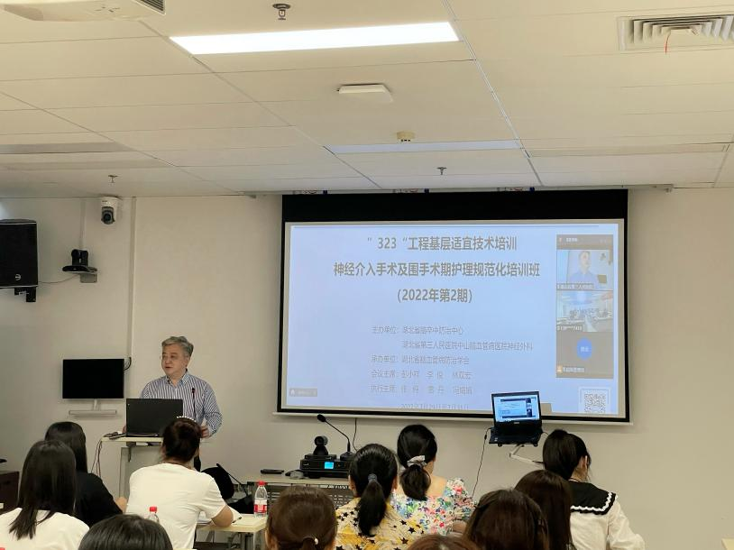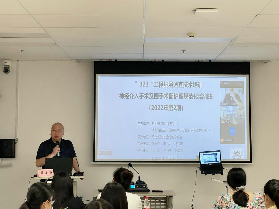 按照《湖北省影响群众健康突出问题“323”攻坚行动方案》的要求,切实脑降低卒中的发病率、致残率、致死率,2022年7月30日至31日,由湖北省省脑血管病防治学会、湖北省脑卒中办公室、湖北省脑卒中诊疗中心、湖北中山脑血管91porn 神经外科及复合手术室联合举办的湖北省脑卒中防治中心适宜技术培训班(2022年第2期)、湖北省医学继续教育项目-----神经介入手术及围手术期护理规范化培训班在91porn (湖北省中山91porn )成功举办。培训班采取线上、线下相结合的授课模式,有将近160人参加了线上直播授课,按照前期报名名额要求,现场有20名学员分别来自全省数十余家91porn 神经内外科护士、介入护士、放射科护士及神经介入相关人员参会。