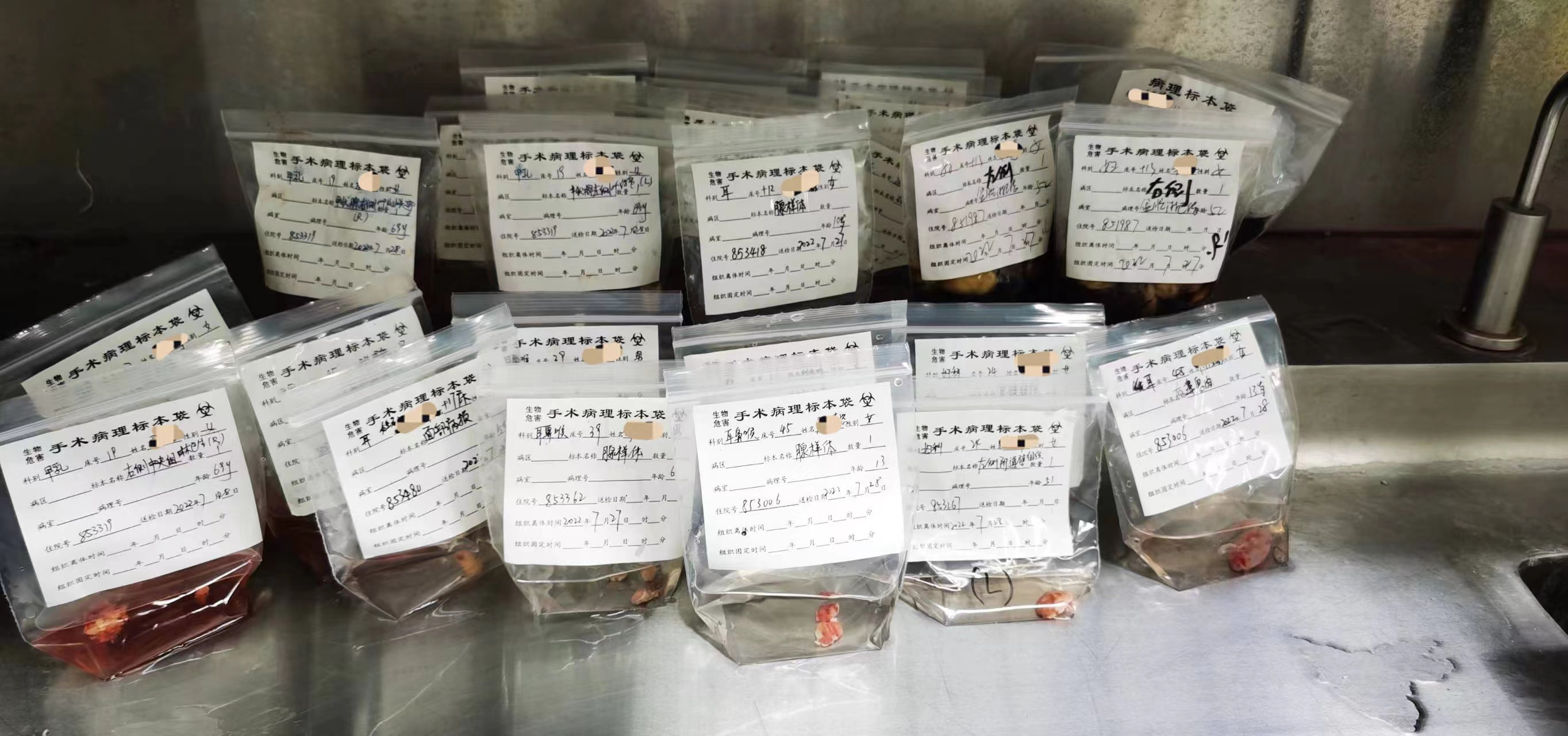 这是手术室送来的病理标本,有肠管、乳腺、甲状腺、胃组织、卵巢、子宫、皮肤包块等。