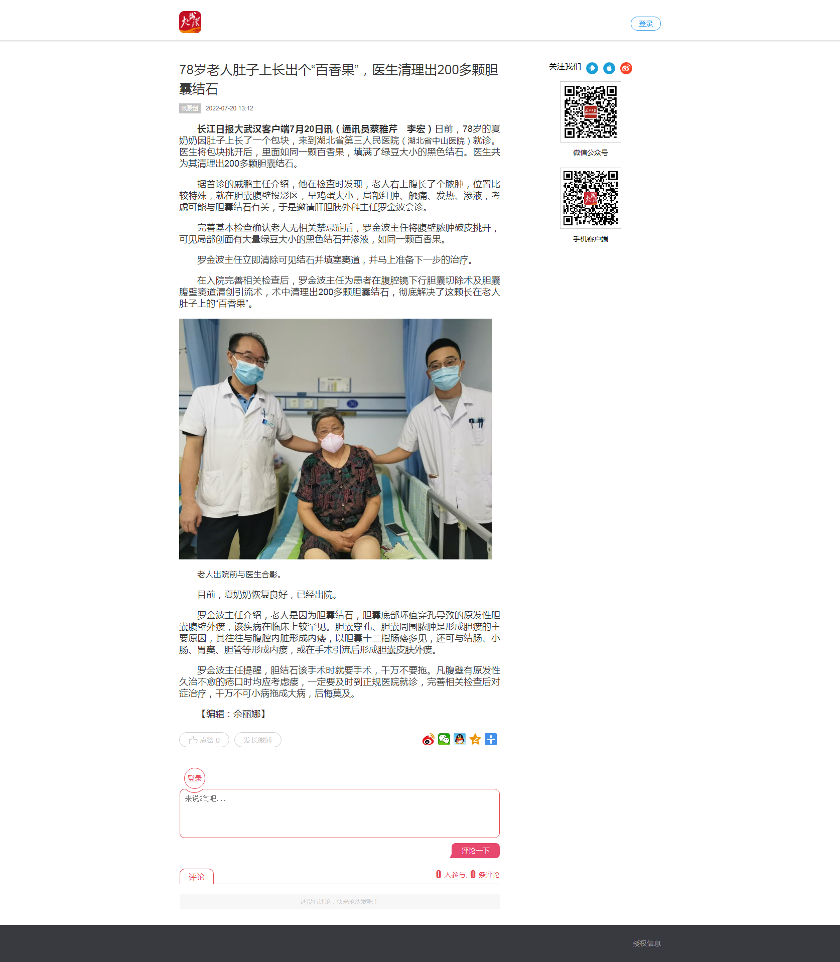 【长江日报】78岁老人肚子上长出个“百香果”,医生清理出200多颗胆囊结石 发布时间:2022-07-20 来源:长江日报 上一篇:【荆楚网】上海方舱患者致谢91porn 医护 下一篇:【新浪湖北健康频道】18岁小伙头痛竟查出脑内海绵状血管瘤,专家:头痛千万不能拖