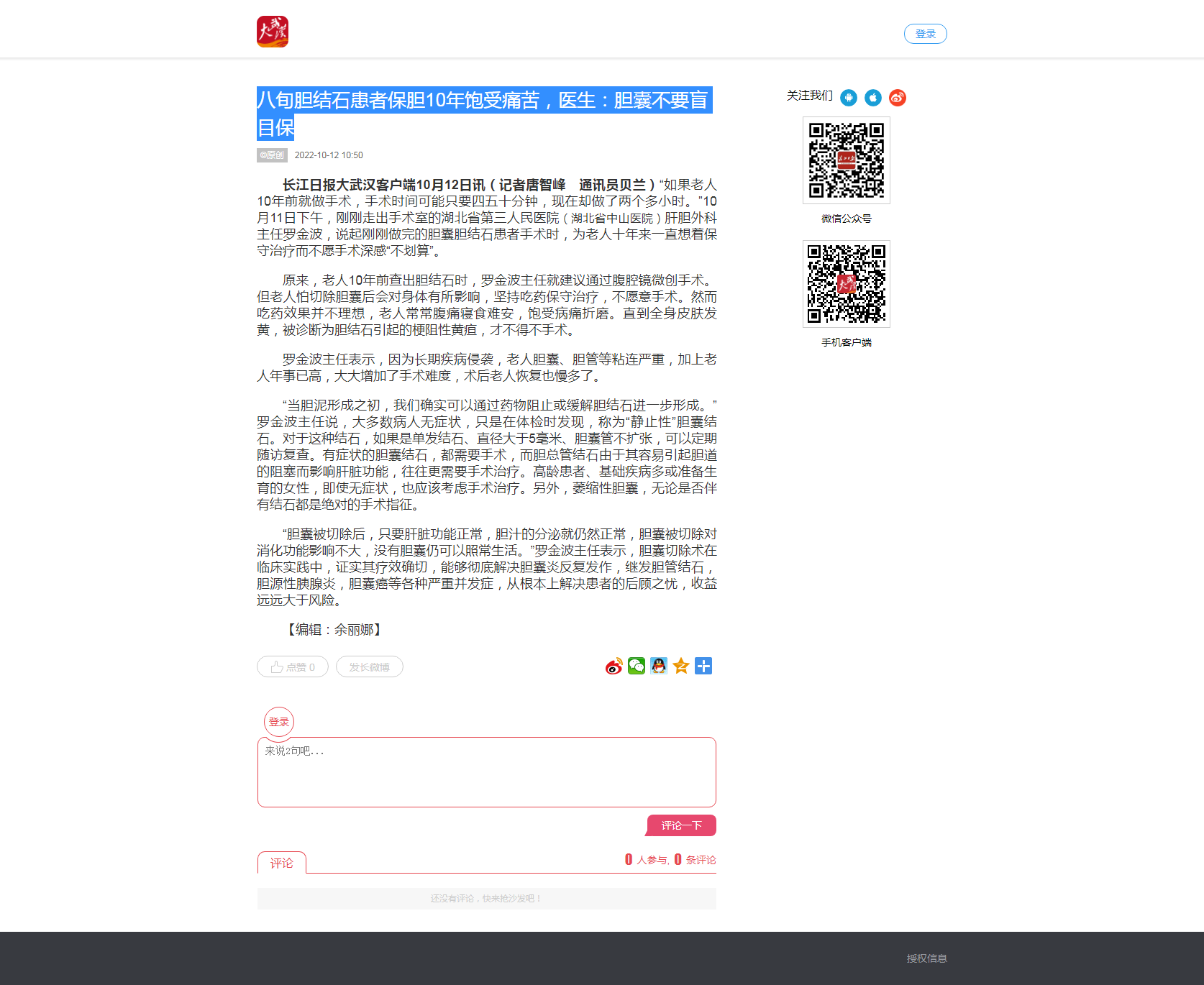 【长江日报】八旬胆结石患者保胆10年饱受痛苦,医生:胆囊不要盲目保 发布时间:2022-10-12 来源:长江日报 上一篇:【荆楚网】“自救”及时抢回一条命 男子突发胸痛原是患上急性心梗 下一篇:【长江日报】筑牢脑卒中防治网底,打通基层救治最后一公里