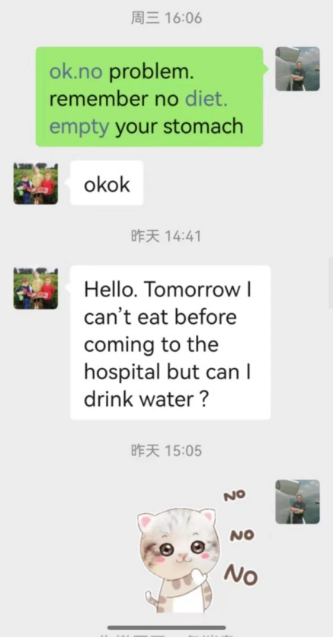 泌尿外科副主任周军通过微信用英语提醒患者检查前的注意事项并详细解释了病情以及检查结果。Daniel对这次就医体验十分满意,向医务人员竖起了大拇指致谢。“虽然语言交流有困难,但是我们有专业的技术、耐心的服务和易懂的语言克服障碍,让我们的医疗无国界。”周军表示。