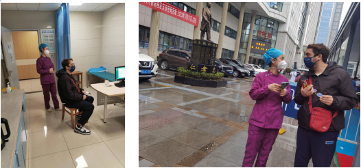 Daniel是一位法国留学生,因腰部疼痛来院就医。他刚来中国不久,对就医流程不是很了解,语言不通加上身体的不适,让他很是着急,结果是越急越说不清。久霞服务中心的导医护士见状通过语言和图片,顺利完成信息询问、流行病学调查和患者体征采集。了解到患者的就诊需求,张久霞护士长迅速联系相关就诊科室和医技部门,开通外籍人员就医绿色通道。