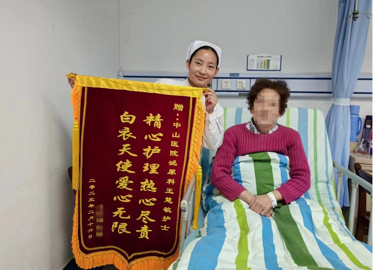 “王护士,我给你送锦旗来了,感谢你对我的关心和照顾,我给你添了不少麻烦,心里总过意不去,这面锦旗就是我对你的感谢。”2023年2月17日,91porn (湖北省中山91porn )泌尿外科病房里患者王阿姨正把一面写有“精心护理热心尽责 白衣天使爱心无限”的锦旗送给护士王慧敏。