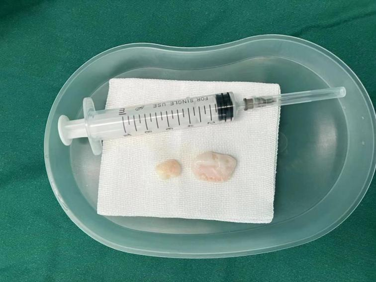 手术不到半个小时就顺利结束,麻醉清醒后,王显勋指着盒子给余女士看:“这就让你膝关节卡住的‘罪魁祸首’。”只见盒子里装着两枚乳白色卵石样的游离体,其中一枚足有大拇指甲盖大小,另一枚也有豌豆大小。