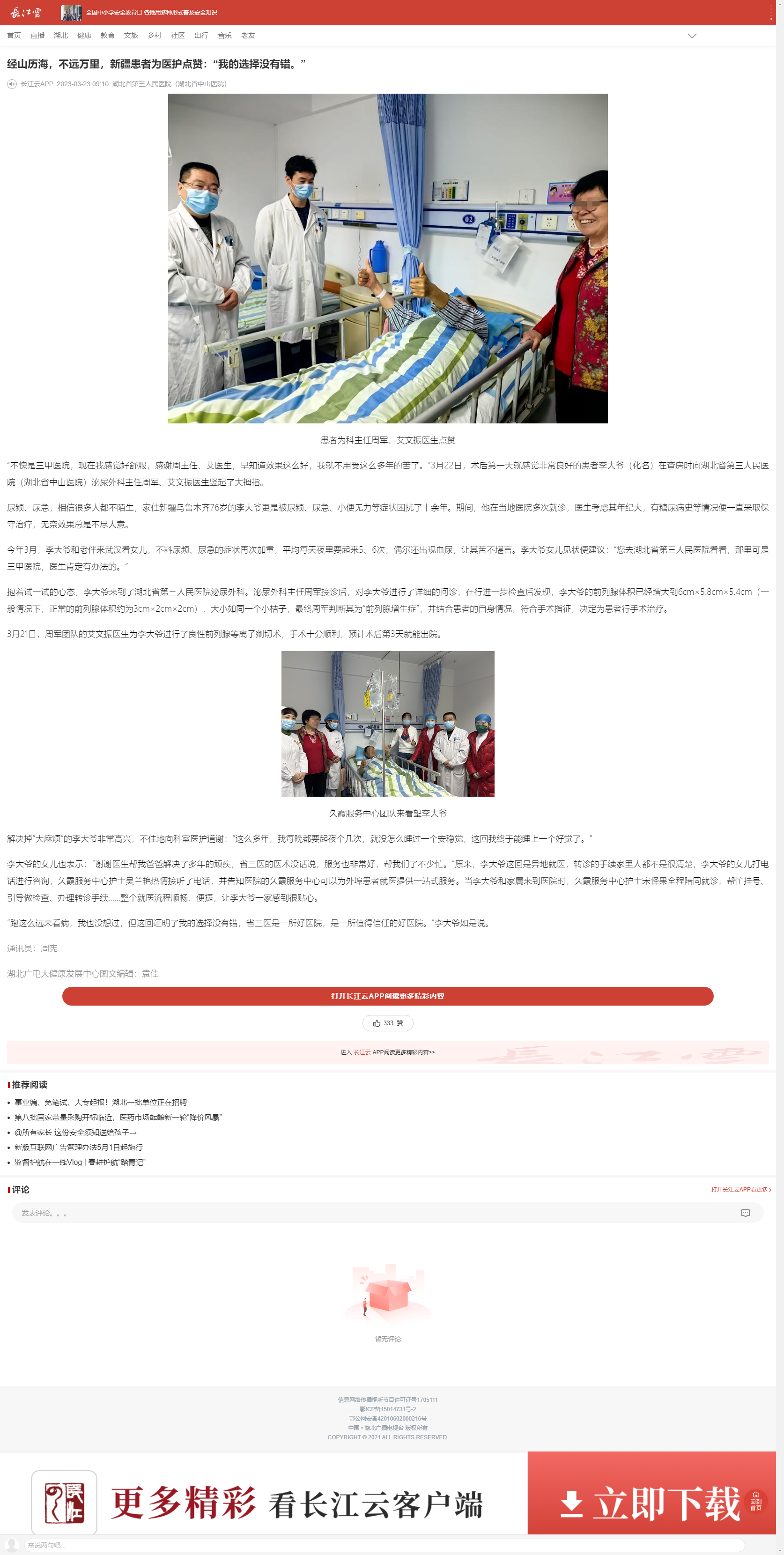 【长江云】经山历海,不远万里,新疆患者为医护点赞:“我的选择没有错。” 发布时间:2023-05-04 来源:长江云 上一篇:【长江日报】7年间两次同样手术体验大不同,患者直呼“舒服多了” 下一篇:【湖北日报】省三91porn 肾病内科党支部开展爱心访视暨主题党日活动