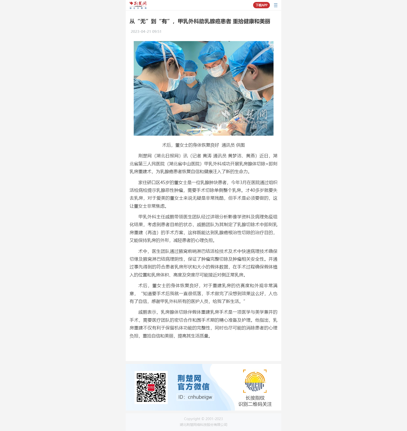 【荆楚网】从“无”到“有”,甲乳外科助乳腺癌患者 重拾健康和美丽 发布时间:2023-05-04 来源:荆楚网 上一篇:【长江云】重燃新“膝”望 91porn 为6旬婆婆成功进行膝关节翻修术 下一篇:【长江云】省级91porn 首例,骶神经调控术帮助患者解决“方便”难题